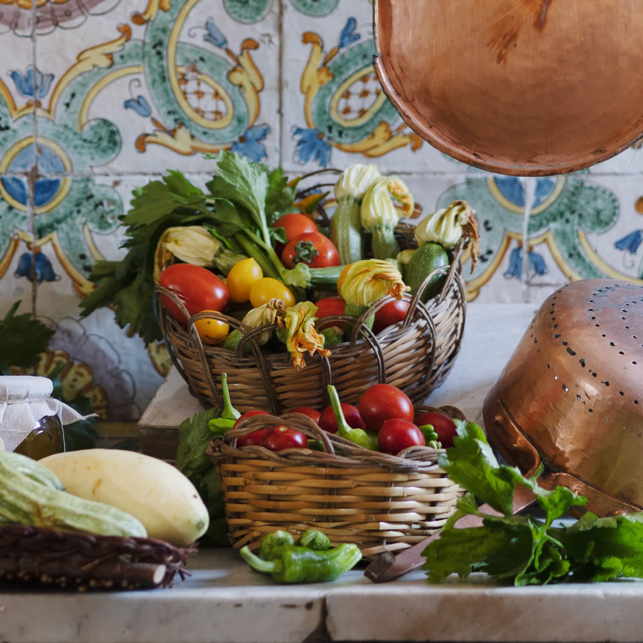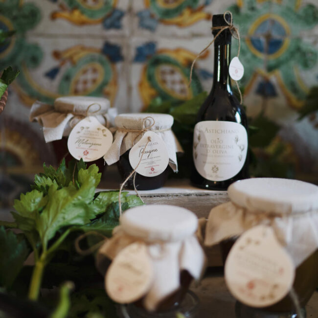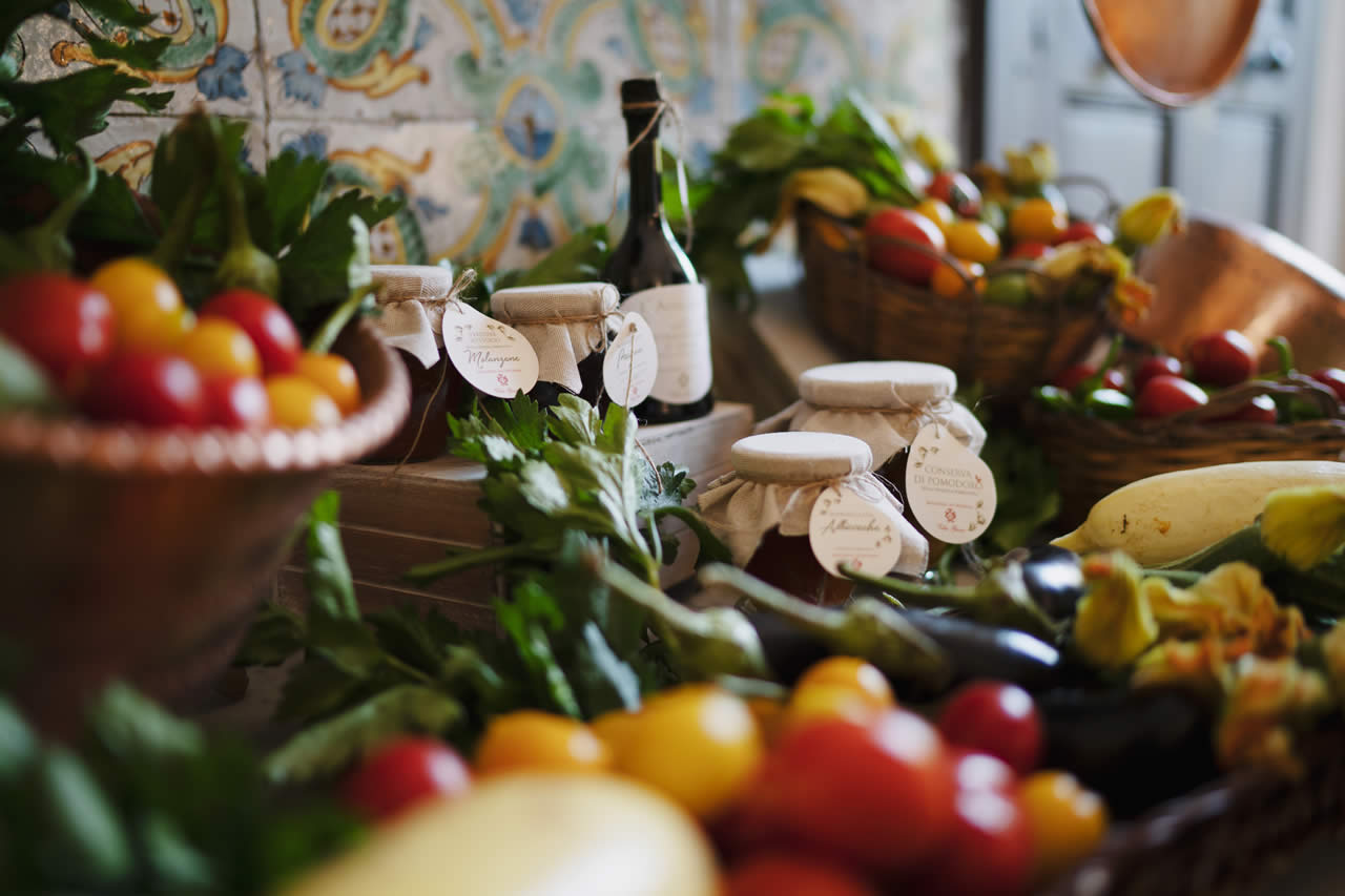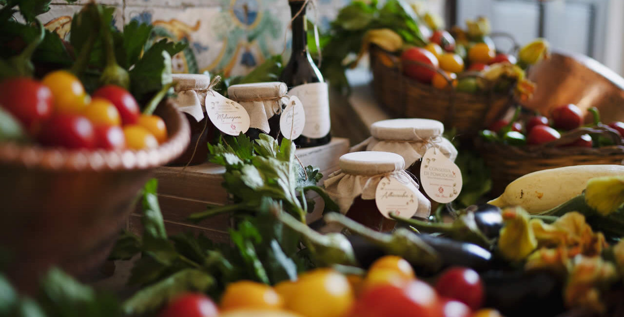 Ortaggi e frutta maturati al caldo sole che, seguendo le antiche ricette, sono trasformati in gustose conserve sott’olio e deliziose marmellate.