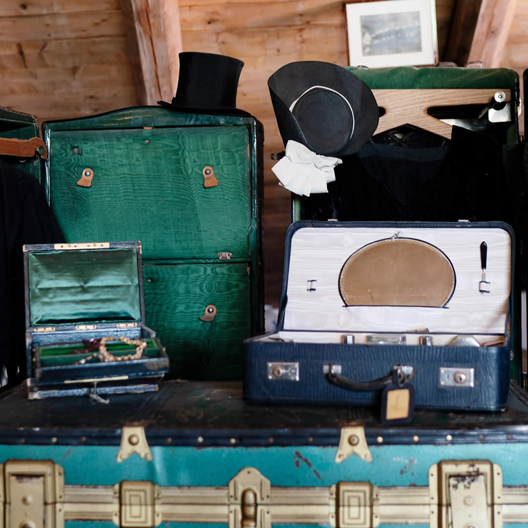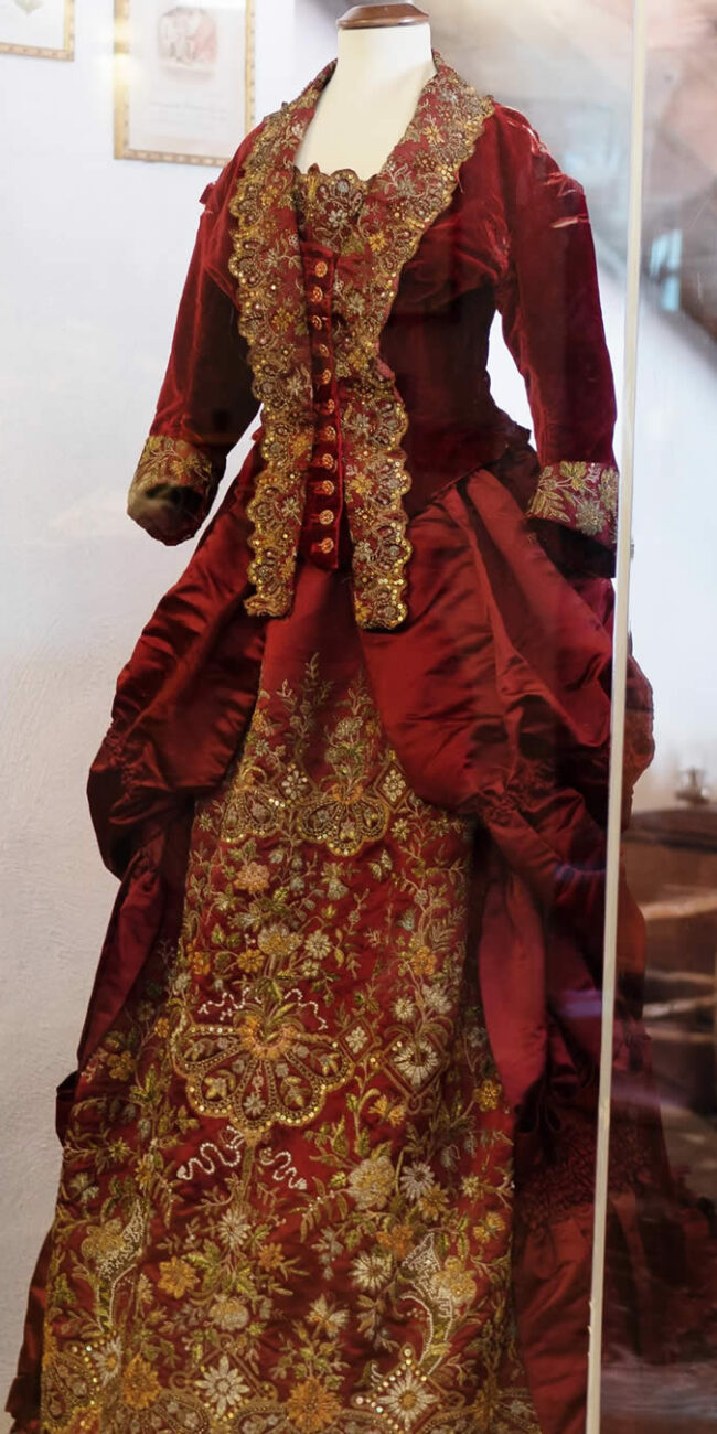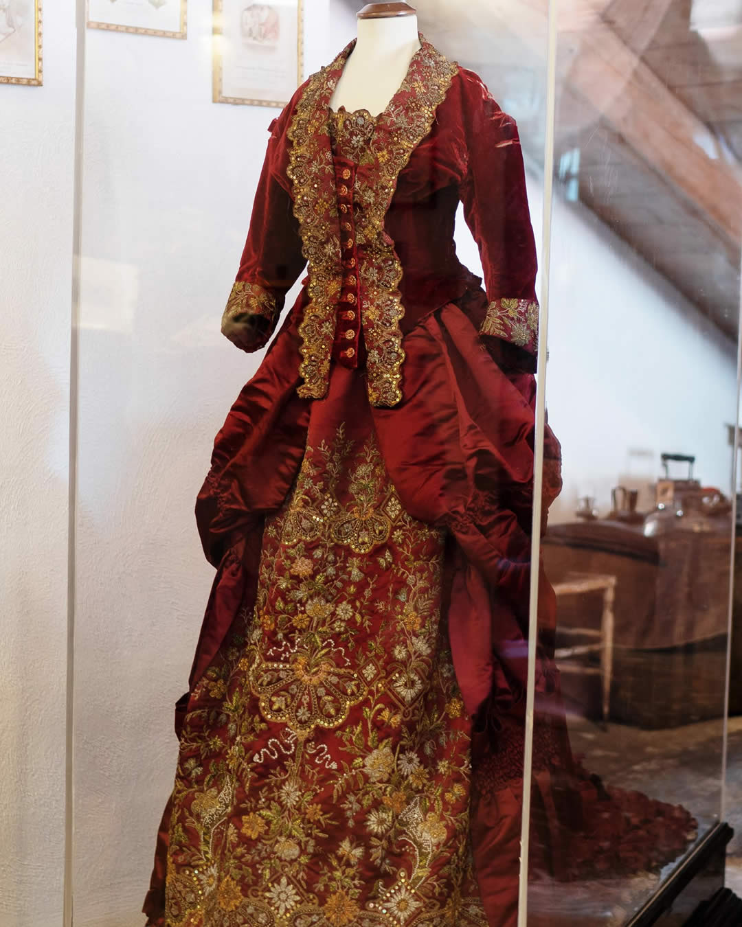 Si parte dalla sezione dedicata al viaggio, necessario per raggiungere il luogo di villeggiatura, con gli enormi bauli, quindi vi sono quelle dedicate agli ospiti più piccoli, con giochi e ed abitini. Splendida la sezione dedicata all’abbigliamento – in cui spicca un meraviglioso abito da sera – completata da una collezione di cappelli, al comparto dell’igiene personale, con diversi set di toilette, ed, infine, la sezione degli oggetti sacri.