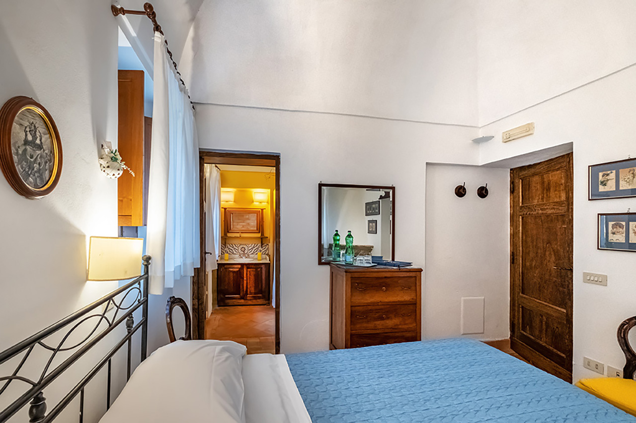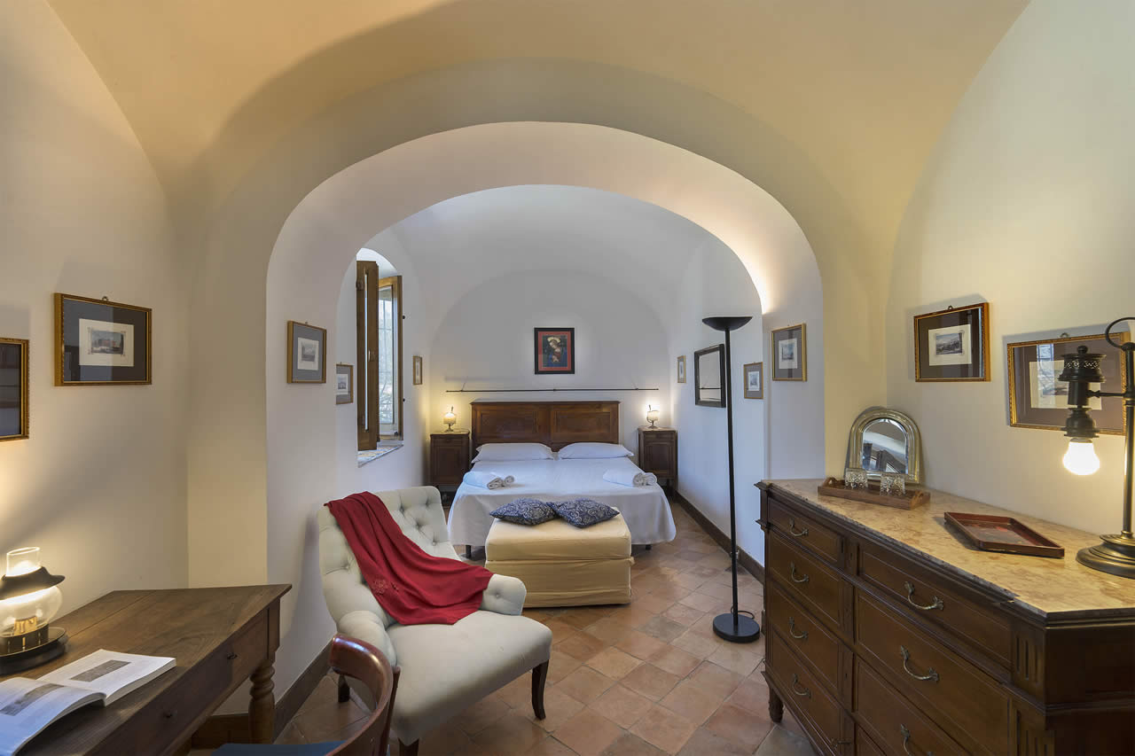 La camera con letto matrimoniale, king size è molto accogliente. Ha due zone distinte separate da un grande arco; un’area living e l’alcova per la zona letto.